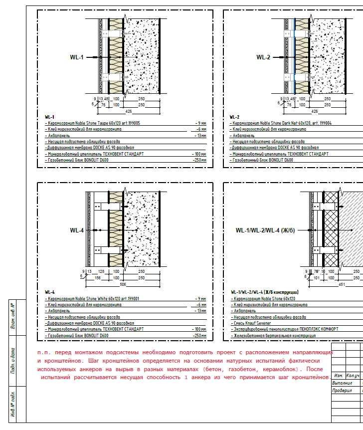 Перед монтажом подсистемы необходимо подготовить проект с расположением направляющих и кронштейнов. Шаг кронштейнов определяется на основании натурных испытаний фактически используемых анкеров на вырыв в разных материалах (бетон, газобетон, керамоблок). После испытаний рассчитывается несущая способность 1 анкера из чего принимается шаг кронштейна.