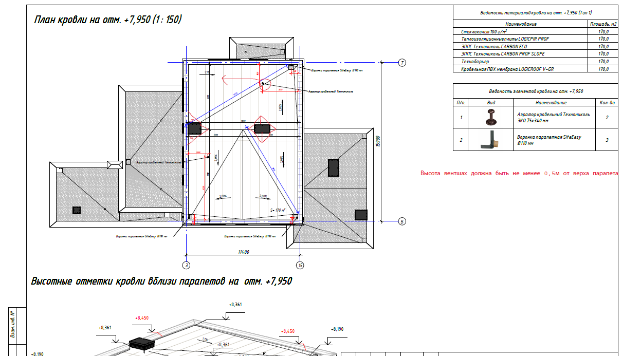 Высота вентшахт должна быть не менее 0,5 метра от верха парапета.
