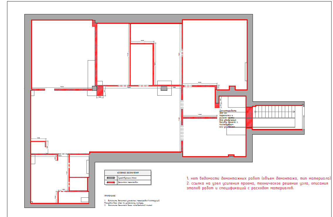 1. Нет ведомости демонтажных работ (объём демонтажа, тип материала). 2. Ссылка на узел усиления проёма, техническое решение узла, описание этапов работ и спецификаций с расходами материалов.