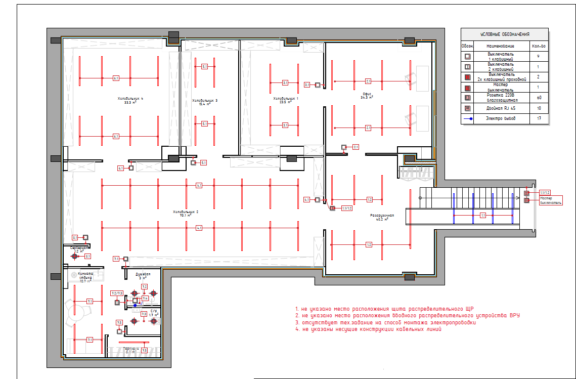 1. Не указано место расположения щита распределительного ЩР. 2. Не указано место расположения вводного распределительного устройства ВРУ. 3. Отсутствует тех.задание на способ монтажа электропроводки. 4. Не указаны несущие конструкции кабельных линий.