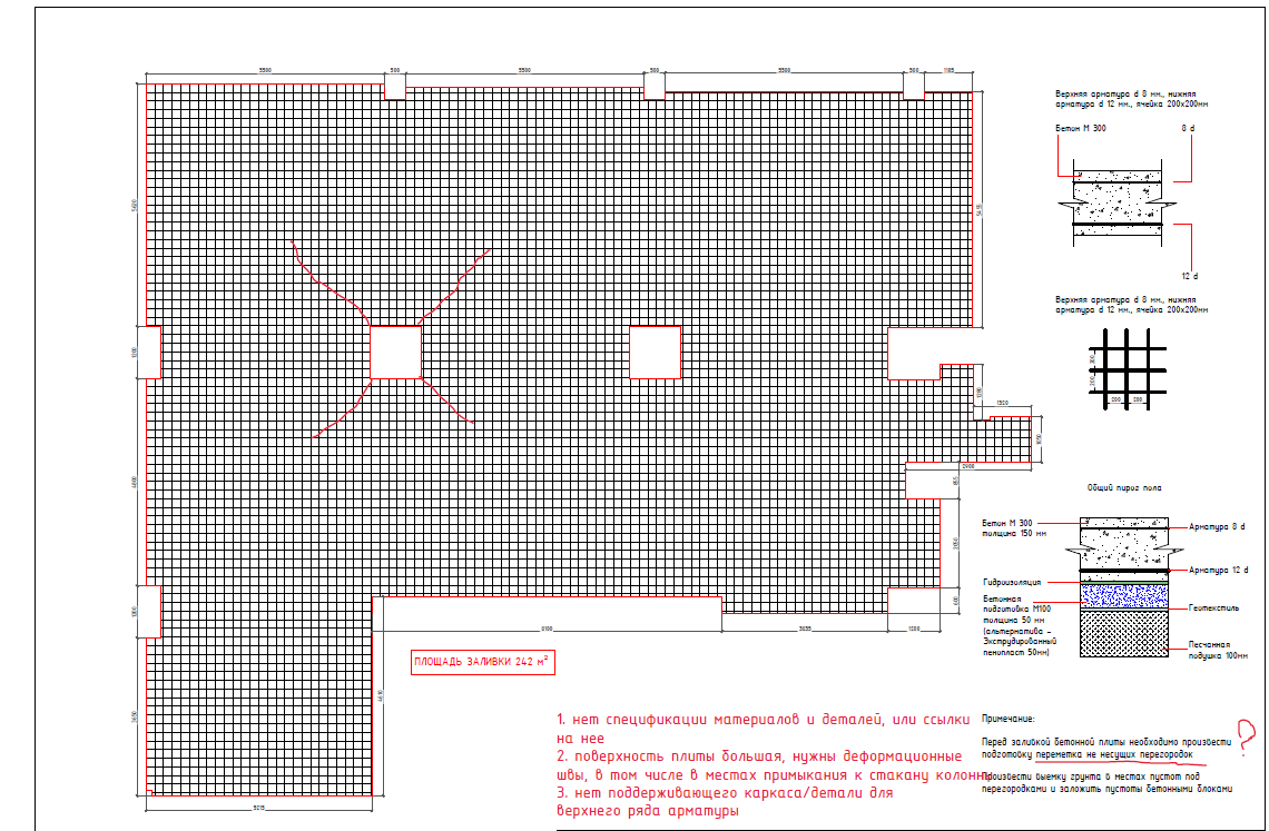 1. Нет спецификации материалов и деталей, или ссылки на неё. 2. Поверхность плиты большая, нужны деформационные швы, в том числе в местах примыкания к стакану колонны. 3. Нет поддерживающего каркаса / детали для верхнего ряда арматуры.